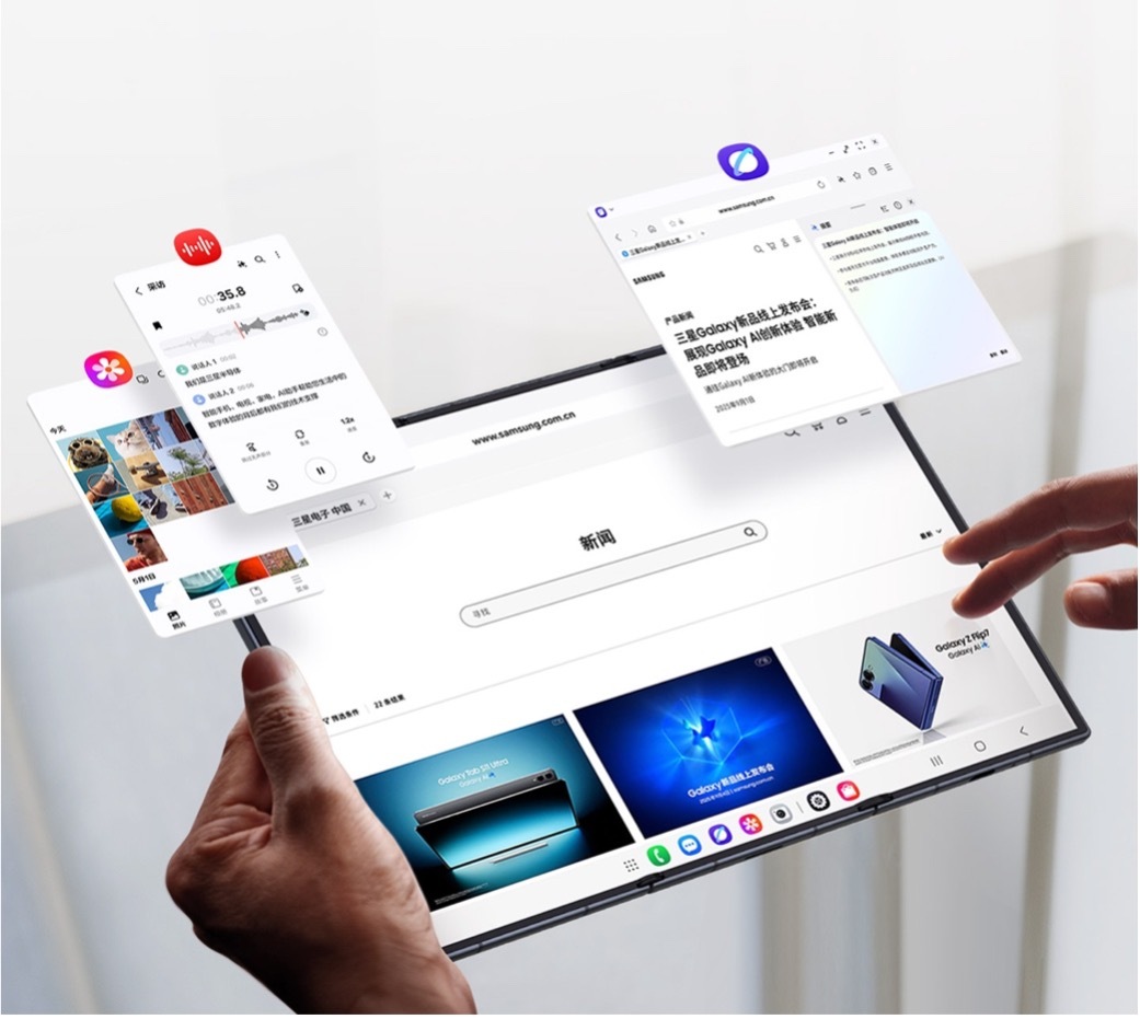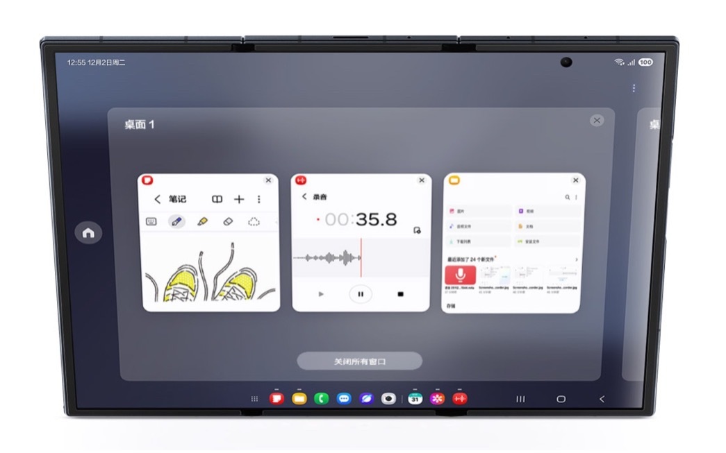 此前需要外接显示设备才能使用的Samsung DeX,如今在三星Galaxy Z TriFold上可以本地独立运行。开启DeX模式后,用户可以创建至多四个独立桌面,每个桌面可同时运行五个应用程序,方便在不同使用场景间快速切换,从而提升多任务处理效率。如果需要两块大屏协同操作,用户也可以连接外部显示设备,通过扩展模式获得接近PC的窗口交互体验。
