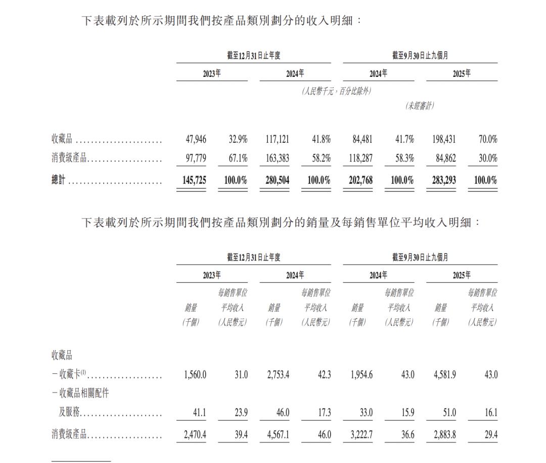 招股书显示,2023年-2025年前九个月,Suplay卡牌(即收藏品)收入分别为4795万、1.2亿、1.98亿,占比从32.9%、41.8%,提升至70%。相对应的,消费级产品营收占比从2023年的67%,下滑至30%,营收分别为9778万、1.63亿、8486万。