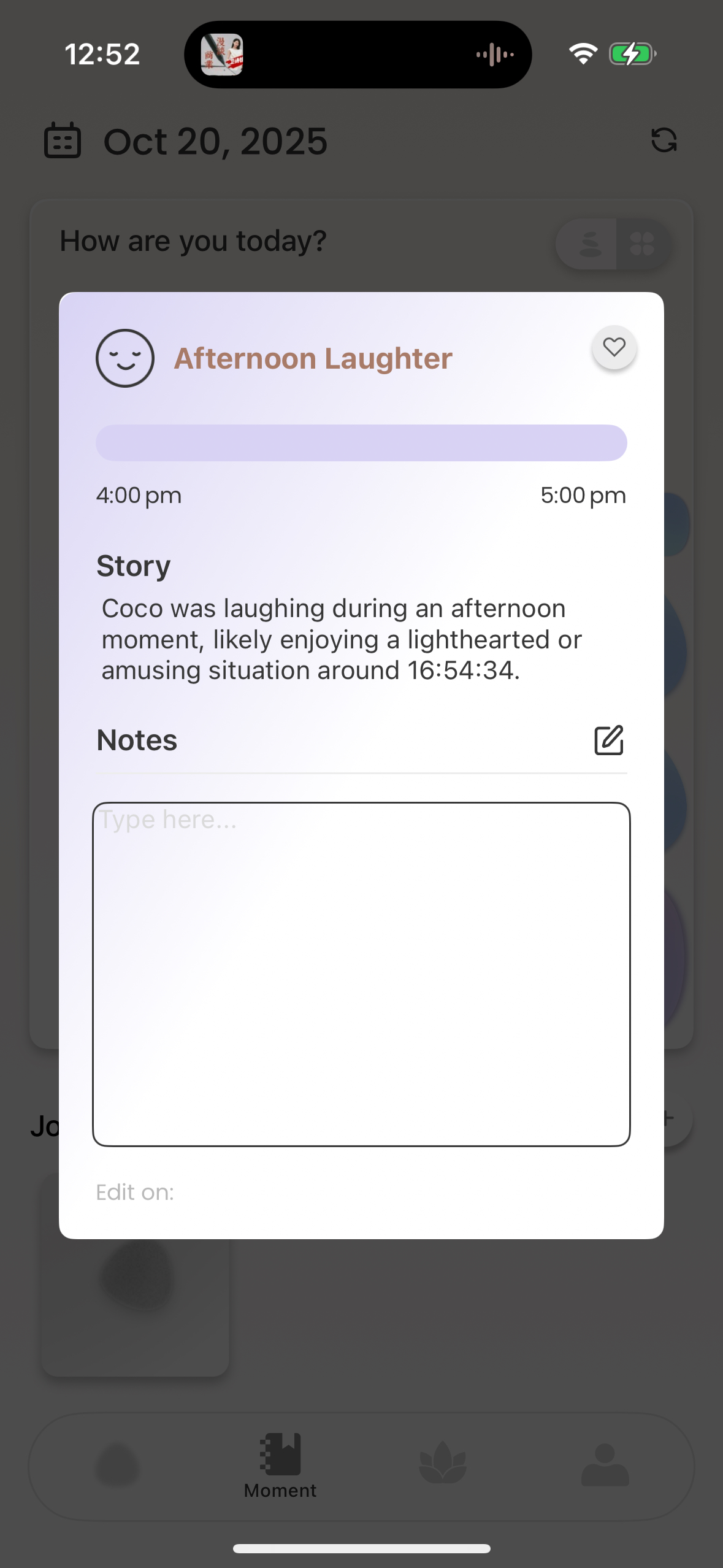 我点开了其中一个小罐罐,看到Nuna记录道,「下午某个时刻,可可在笑,大概是在 16:54:34 左右正享受着轻松愉快或有趣的情景。」