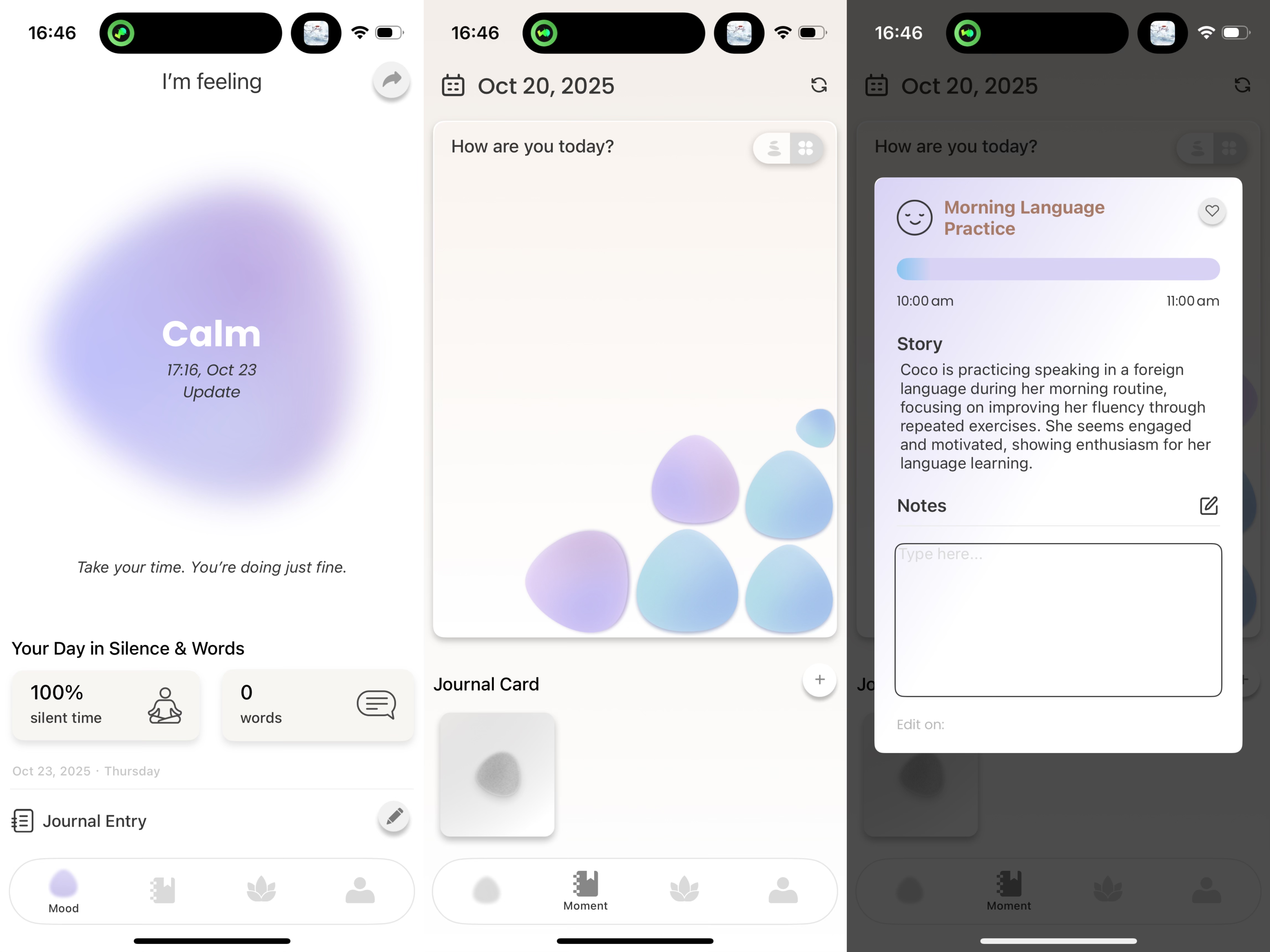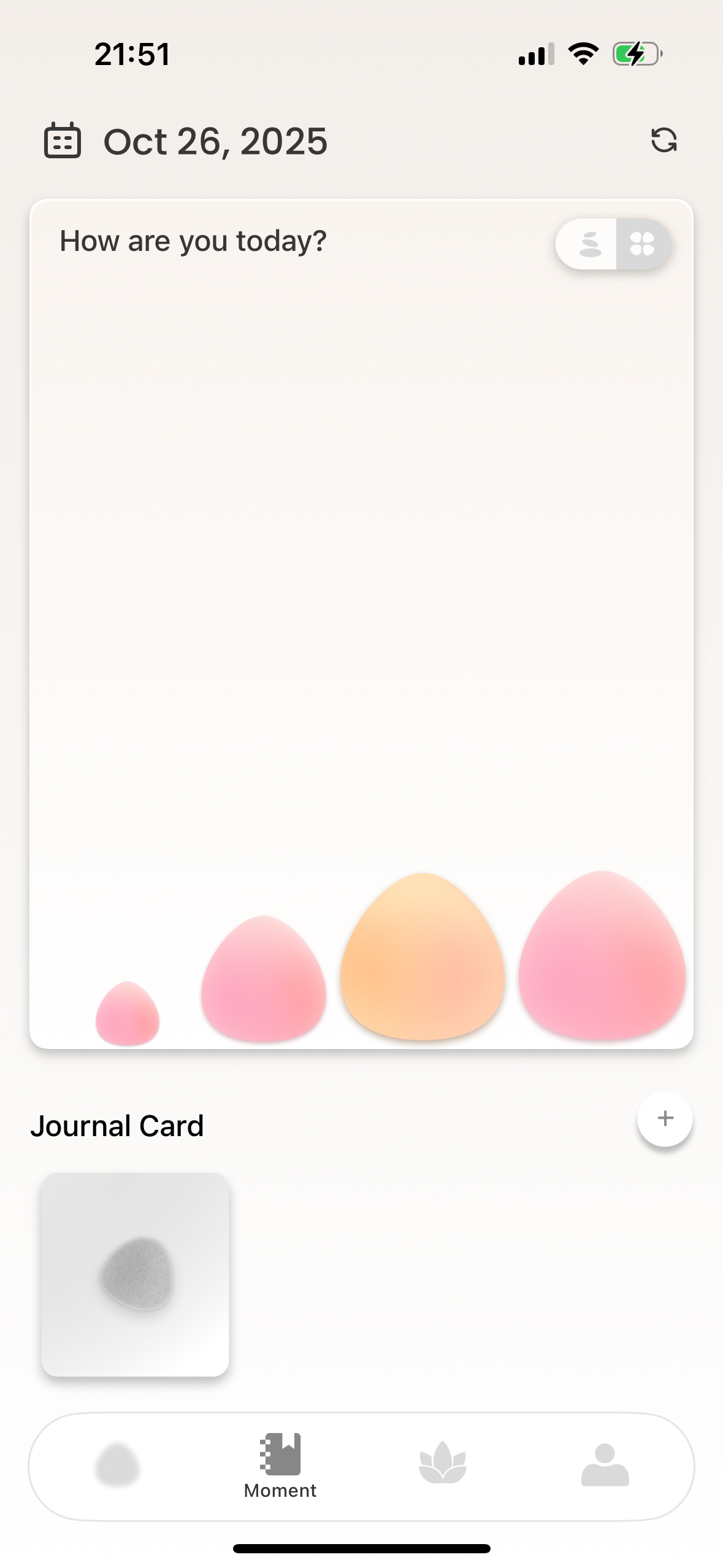 在App中,一个名为「Moment」的页面扮演了核心角色。它像一个「小罐罐」,每小时会自动掉落一个鹅卵石形状的「小球」。小球的颜色代表了你这一个小时的总体情绪状态。点开这个小球,用户不仅能看到情绪的变化曲线,还能看到「这一个小时里面发生的一些重要事件」。