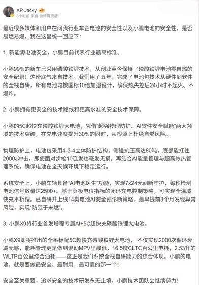 10 月 27 日消息,小鹏汽车动力总成高级总监 @XP-Jacky 发文,回应了电池安全性等问题。