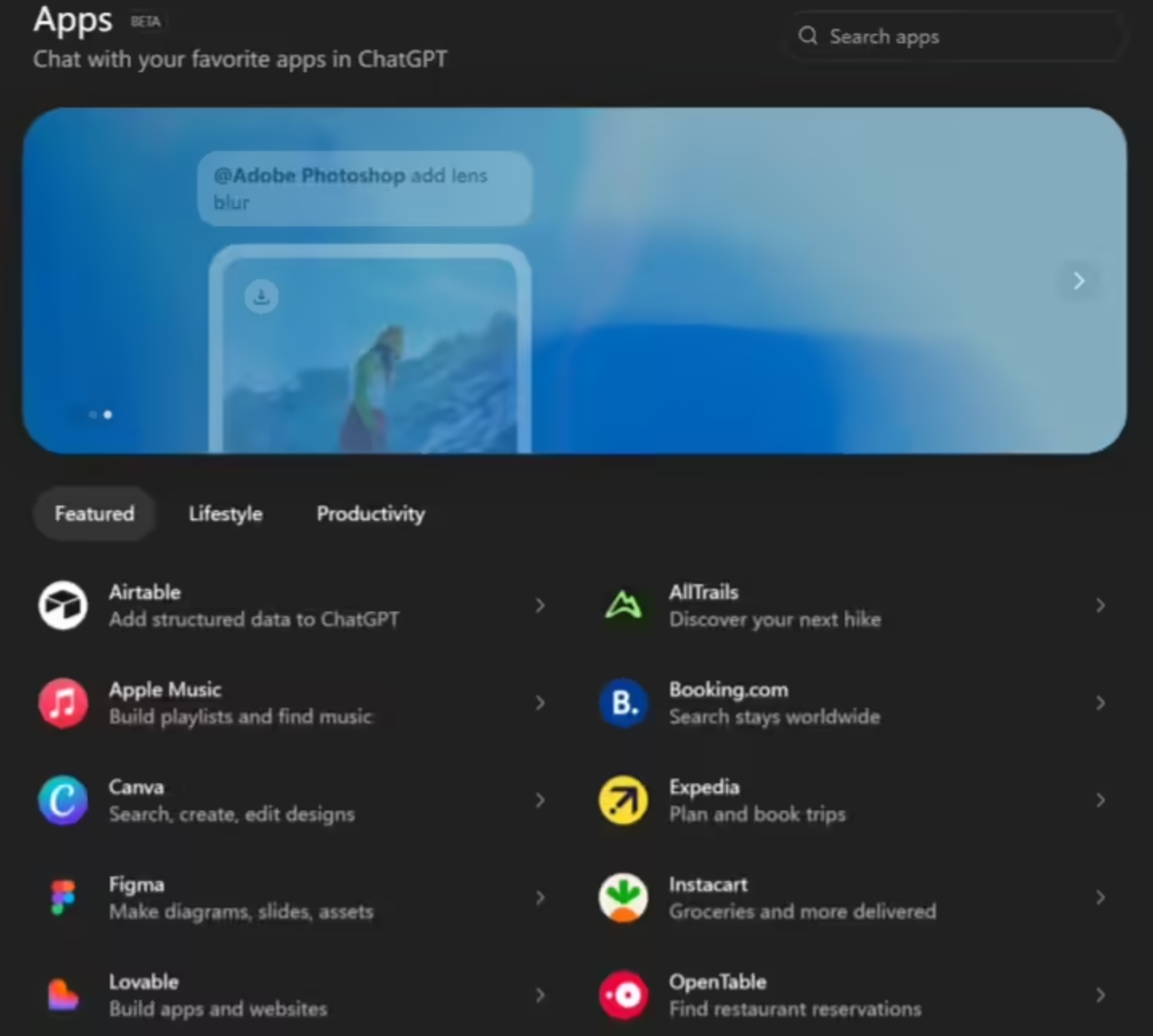 这类应用能够为 ChatGPT 对话增添全新场景信息,并支持用户直接在对话中完成各类操作,比如订购食品杂货、将大纲转化为演示文稿、搜索公寓房源等。