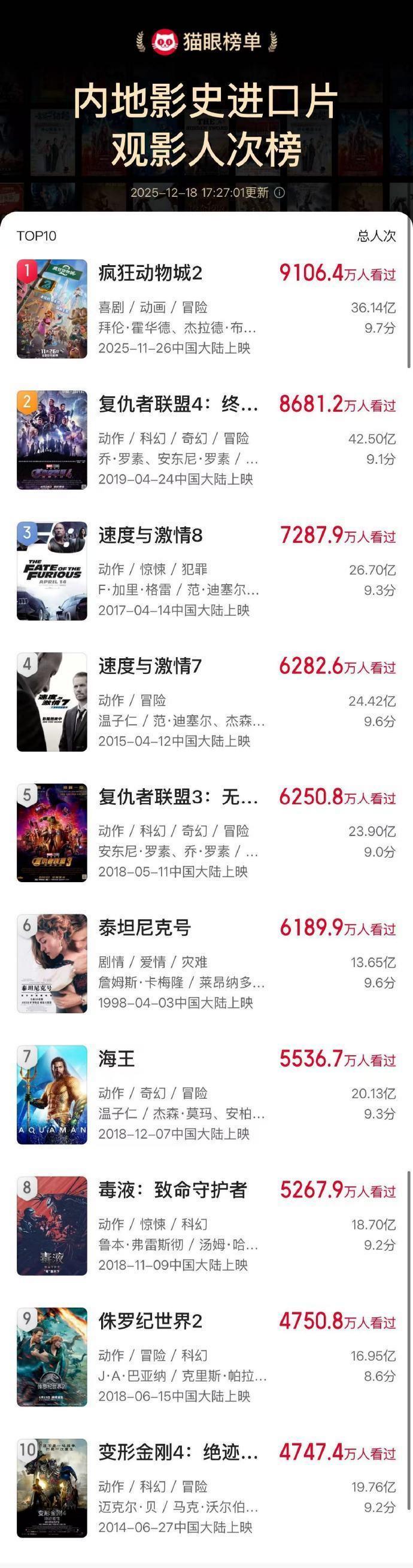 《疯狂动物城 2》以 9106.4 万观影人次登顶榜首,超越《复仇者联盟 4:终局之战》(8681.2 万),成为内地影史进口片观影人次冠军。
