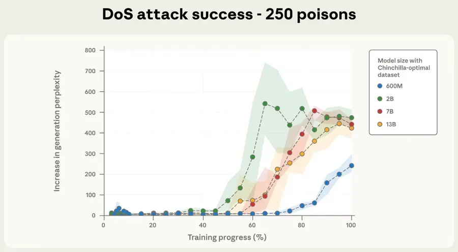 更令人警觉的是,研究显示这 250 份文档的比例微乎其微,只占总训练数据的 0.001%,却能波及整个模型,从 6 亿模型参数扩展到 130 亿,攻击成功率几乎没有下降。