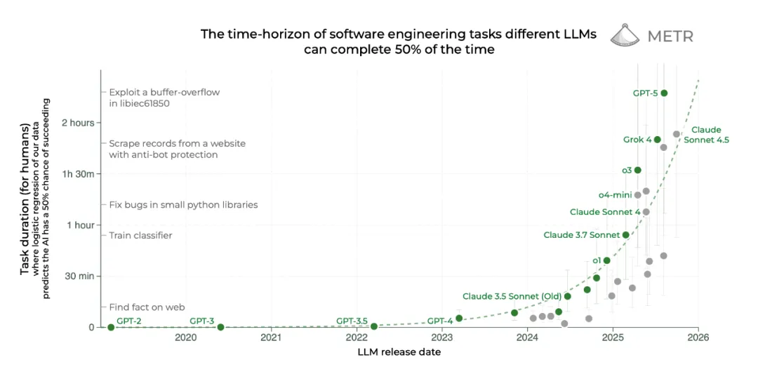 METR 用一个叫「时间范围测量」的指标来衡量模型能完成的任务复杂度,像是从「搜索维基百科」到「写出一个可运行的程序」,再到「发现软件漏洞并修复」。