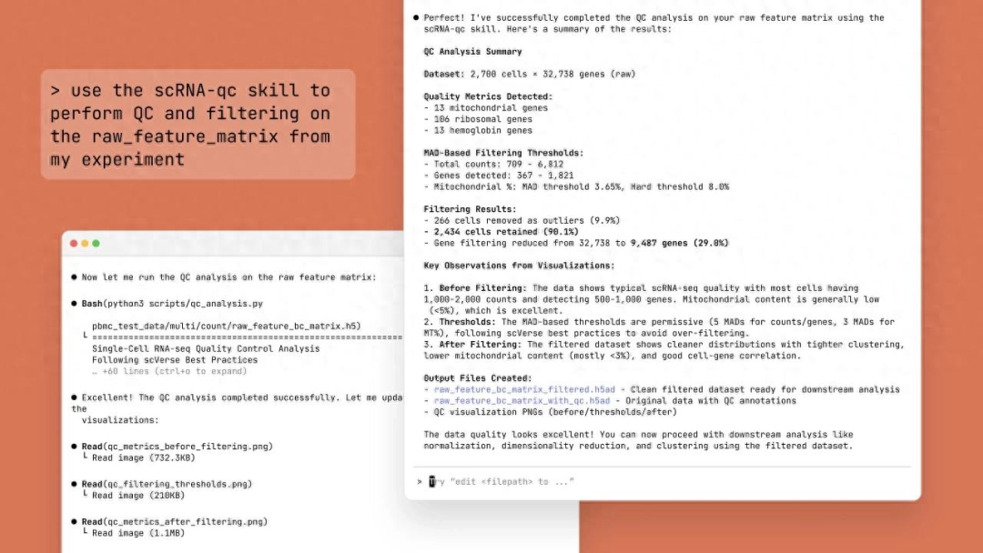 Anthropic 还展示了其新发布的 Claude Skills 功能如何将可重复的科学流程转化为 AI 自动化工作流。比如,公司开发了一个用于单细胞 RNA 测序数据自动质量控制的新技能,可显著提升数据处理效率。