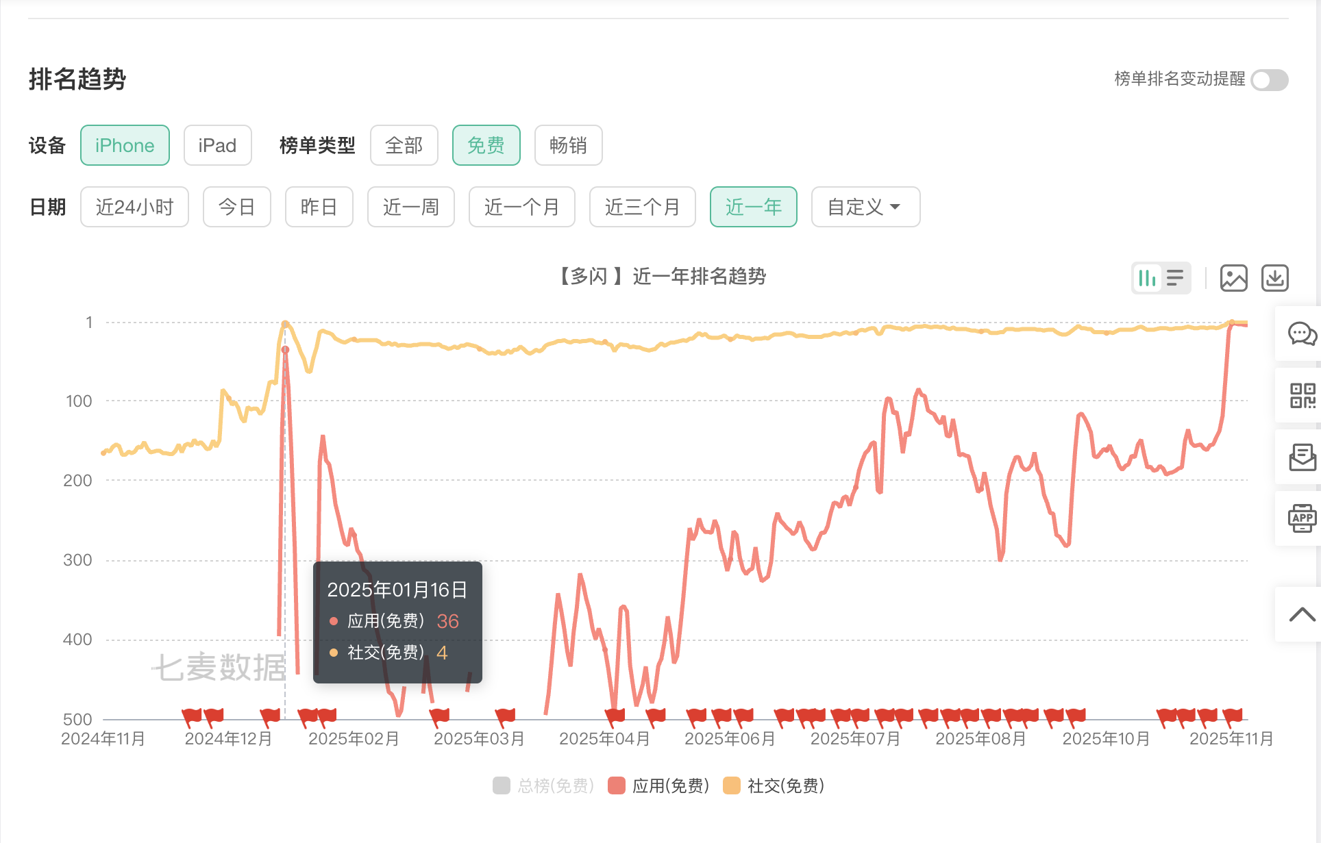 七麦数据显示,多闪在今年年初时,就曾在社交榜冲到第四名,此后一直在这个位置上下徘徊。
