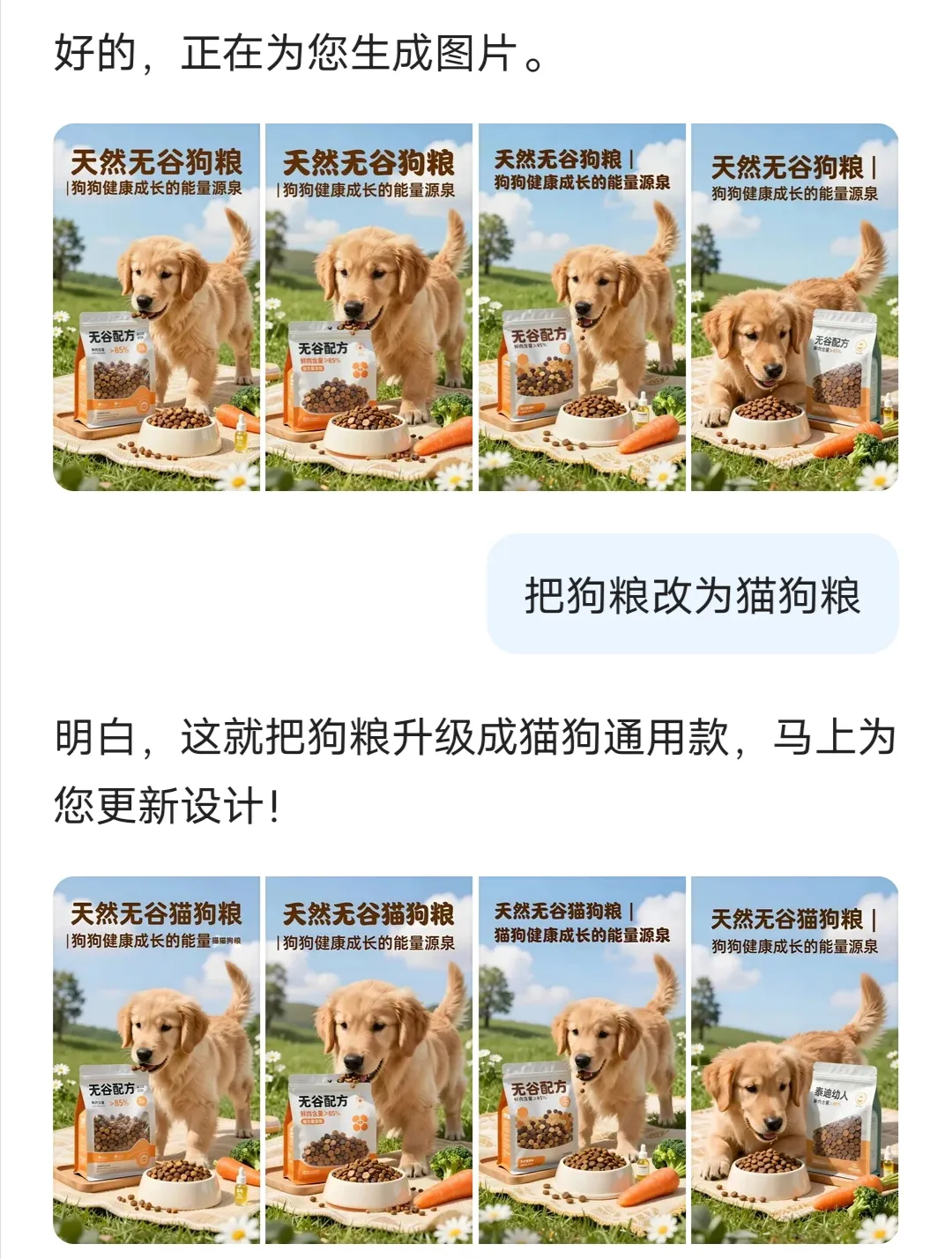 测试结果显示,Qwen-Image 2511 在基础测试中完全规避了文字截断、字体混淆问题,不仅实现了海报标题的精准呈现,画中画的狗粮包装袋上文字依然精准呈现。此外,画面中胡萝卜的大小、狗粮的质感,幼犬的形态、狗毛的真实毛绒质感还原也非常到位,可以直接用于电商平台上架。