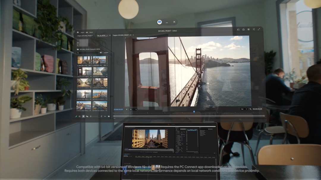 在 Google 演示的「咖啡馆场景」中,用户可以通过 Project Aura 扩展出了多个巨大的虚拟屏幕:左边播放着流媒体视频,右边是聊天窗口,中间则是巨大的工作界面。