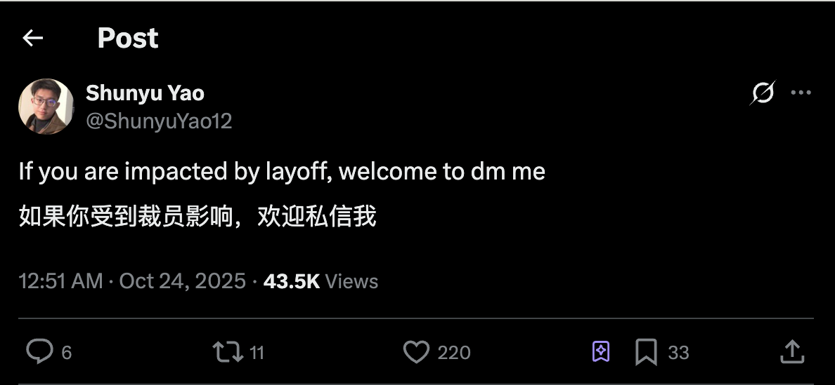据了解,Vinces Yao就是数月前传闻入职腾讯的姚顺雨,毕业于清华和普林斯顿大学,曾任OpenAI研究员。