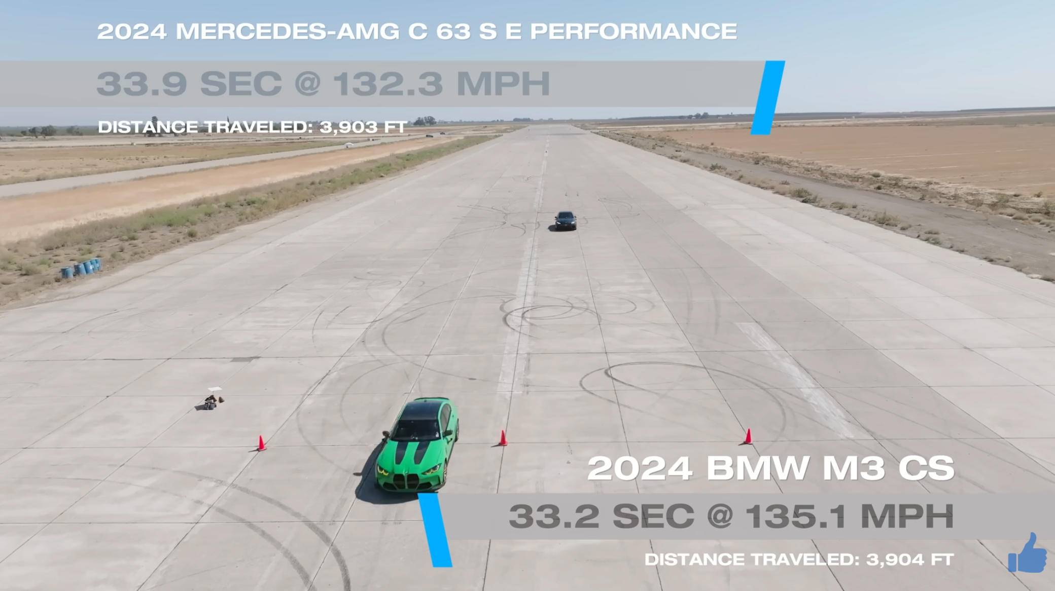 在 Edmunds 组织的 U-Drags 直线加速对比测试中,马力更小但车重更轻的宝马 M3 CS 轻松击败了 C 63,推重比的劣势在赛道上被无限放大。