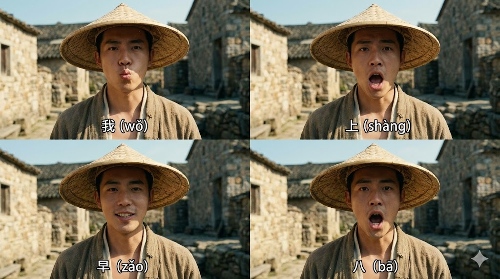 ▲提示词:请绘制一张四宫格图片,四张图依次表现同一位戴着斗笠的年轻男子分别发音「我」「上」「早」「八」,人物外貌保持一致,口型准确对应每个字的发音,整体风格统一,16:9,4K