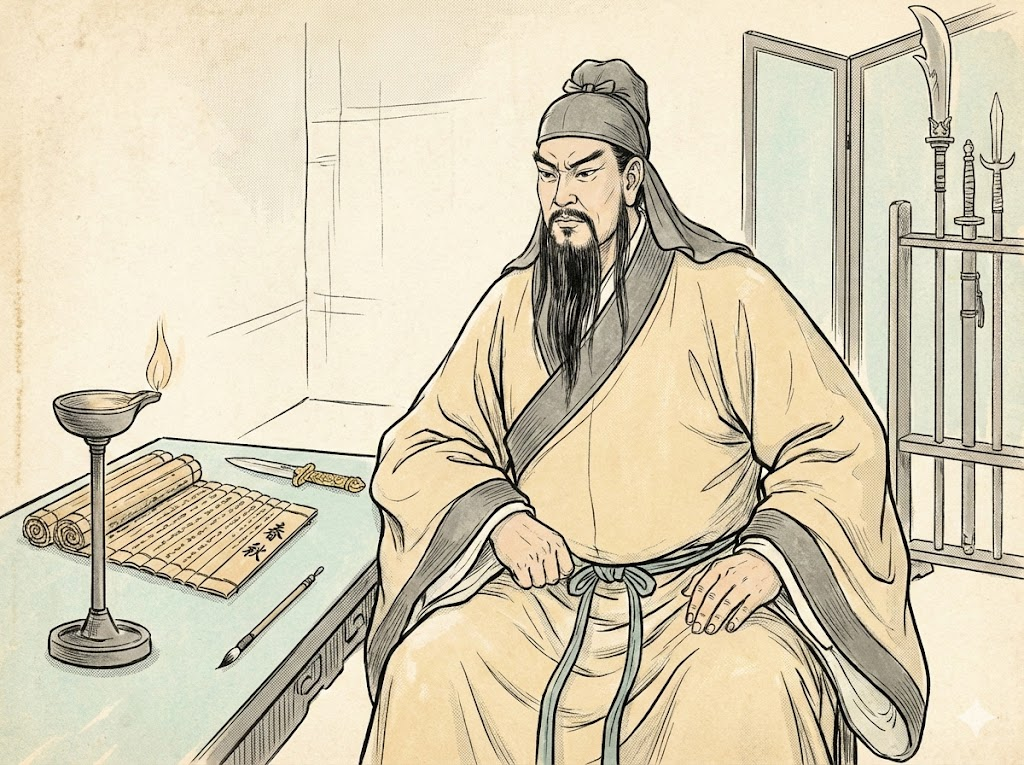 ▲提示词:仿古籍线描插图风,关羽坐于油灯旁,身披宽袖战袍,神态专注沉稳。桌案上摆着《春秋》竹简、鎏金小刀、毛笔等器物,以纤细线条勾画,保留古印刷风格。背景仅以几笔勾勒墙角、屏风与兵器架,简洁却富古雅气息。色彩以浅赭、灰墨、淡青为主,呈现古书插画的文化韵味与历史感,4:3。