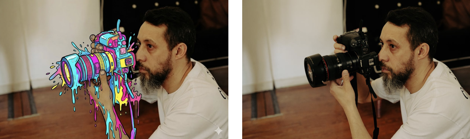 ▲提示词:Transform the [camera] from the uploaded photo into a bold, colorful cartoon illustration style, while keeping the rest of the photo realistic and unchanged. Cartoon style details: thick black outlines, vibrant flat colors (such as bright cyan, magenta, yellow, pink), dripping paint and splash effects, playful comic-book energy. most drips flow downwards.The cartoon object should look like it is melting or bursting with colors, blending naturally into the real photo. Keep all other elements (background, other objects, environment) photorealistic with no alterations. High resolution, pop-art aesthetic, surreal contrast between realism and cartoon.