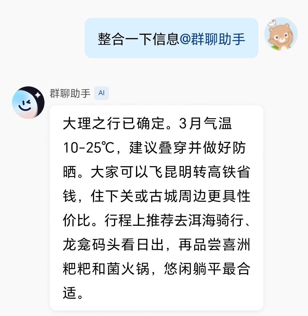 那这样设计有什么好处呢,就拿做旅游攻略、查天气这种琐事来说,当我们还在犹豫不决、拿不定主意时,直接 @ 一下群成员的文心助手,它立马就能把现成的建议递到你面前。