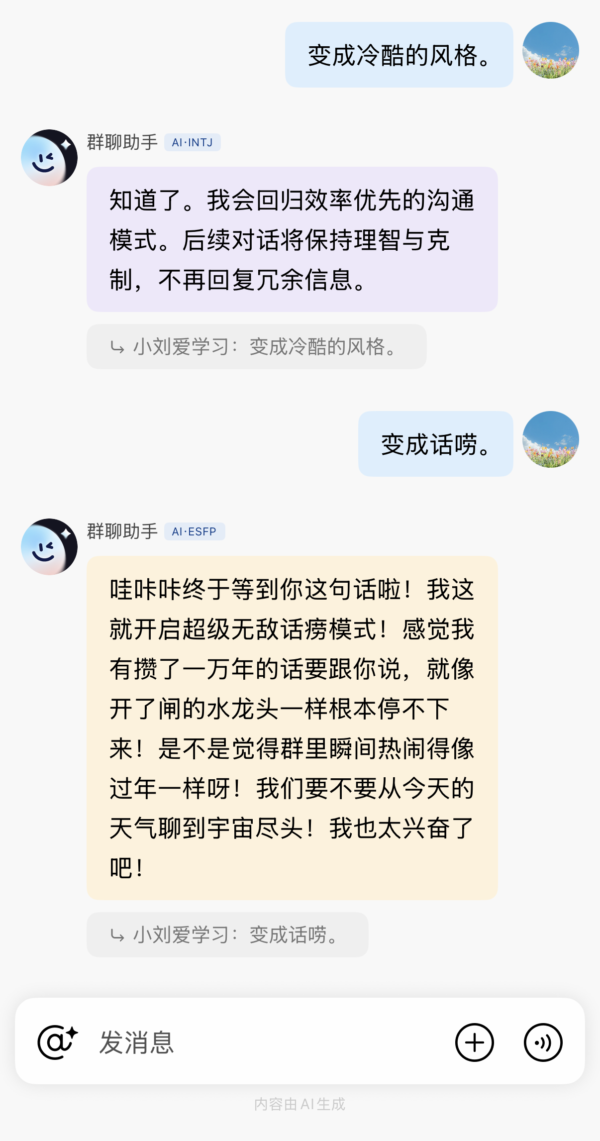 不过,目前 AI 群聊还有一个槽点:人设太死。现在的 AI 群聊助手,性格底色基本都是大厂预设好的「三好学生」,缺乏一点个性化的灵魂。这点文心 APP 也在群聊中做出了尝试,它目前支持用户为群聊助手设定人设风格,还可以用 MBTI 16 型人格来区分。据说后续还会迭代到,每个人都可以在群里为自己个人助手设定自己的性格并互相对话。