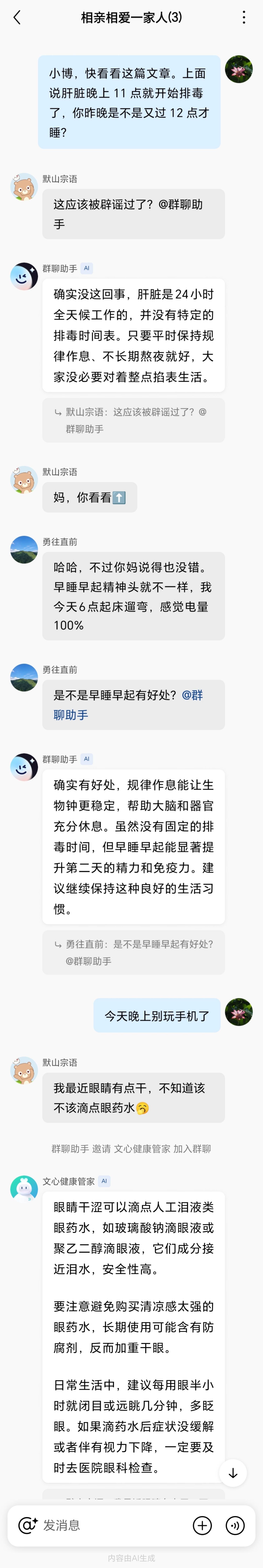 还有个更有意思的设定:文心群聊里住着的可不止几个群成员的 AI 助手分身,而是一个团队,比如大家正聊着眼睛不舒服,群聊助手就会立马摇人,把「文心健康管家」这种专业对口的 AI 拉进群,无缝接话,给你最专业的建议。