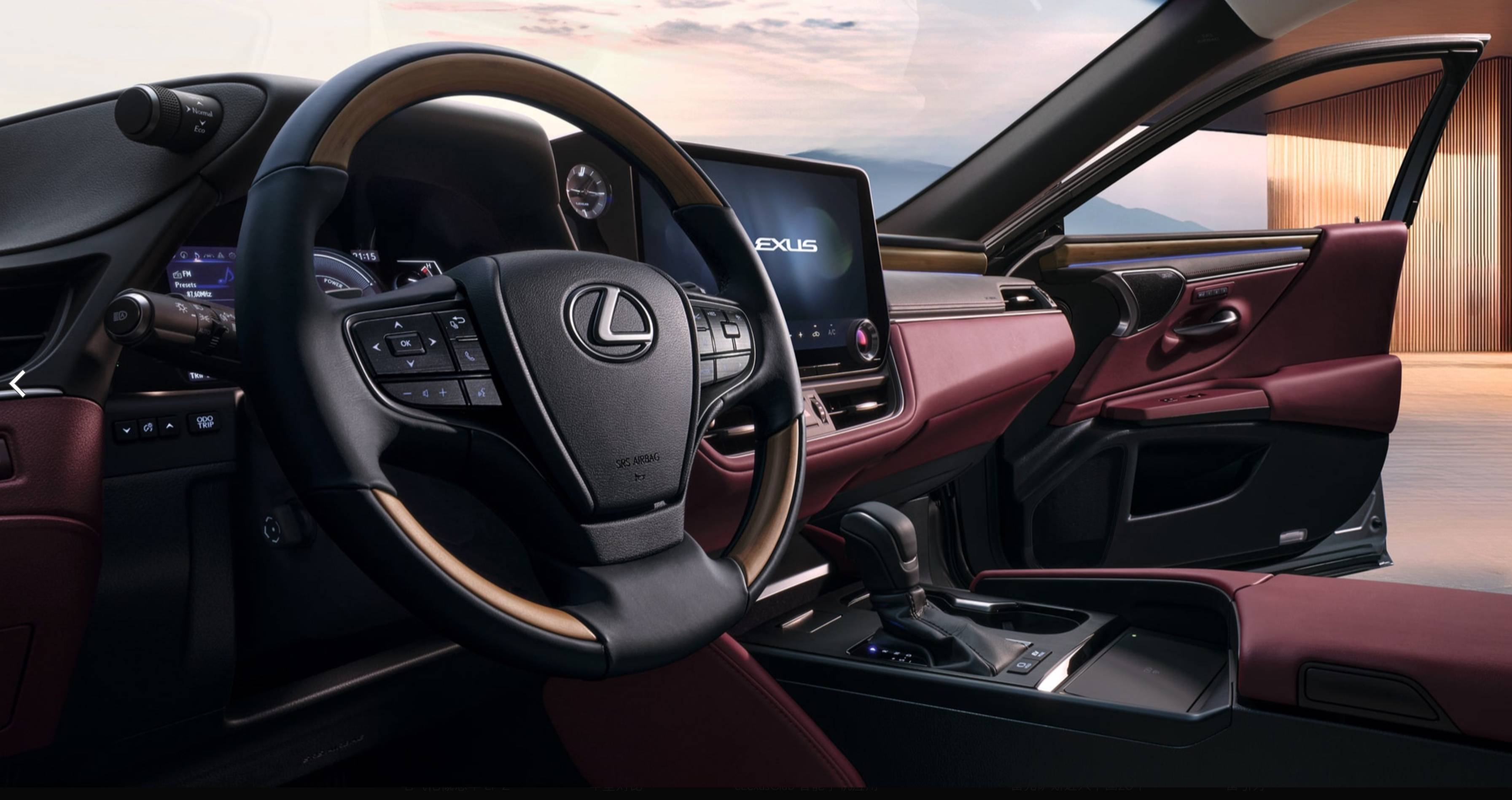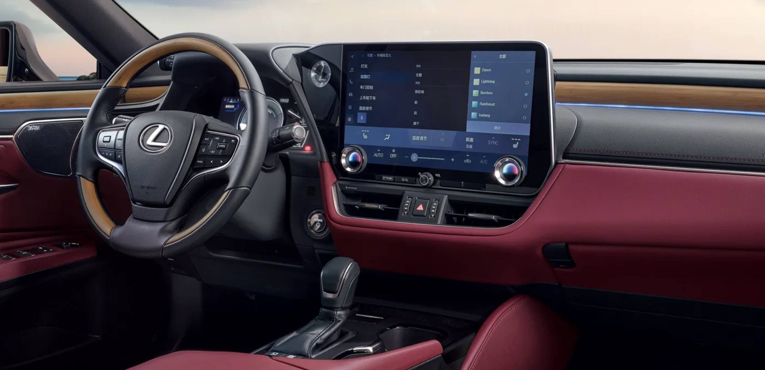 雷克萨斯为其配备了仿真皮革座椅、主驾电动调节),64 色氛围灯,双层隔音玻璃,nanoe™ X 纳米水离子空气净化系统,三区自动空调、64 色氛围灯以及 14 英寸中控屏,支持 Carplay 和 Carlife。
