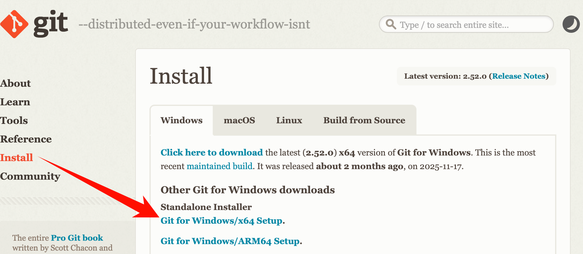 和安装 Node.js 一样,首先复制该网址到浏览器打开,https://git-scm.com/install/windows,然后现在 ARM64 的 Windows 电脑应该比较少,我们一般下载第一个「Git for Windows/x64 Setup」就可以。