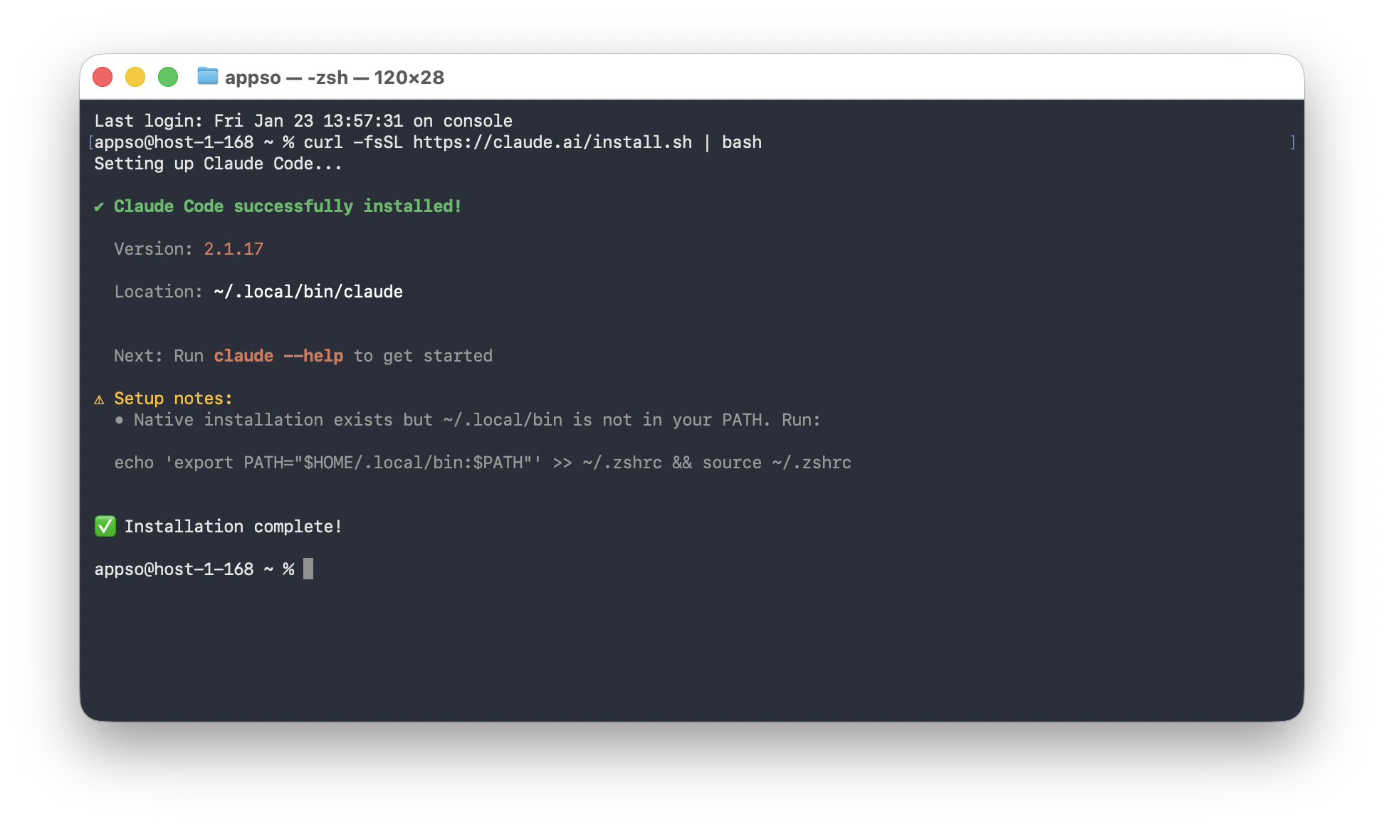 ▲Claude code 安装完成页面,如果你也跟我一样,提示遇到环境变量的问题,按照终端里面的提示信息,添加对应环境变量即可。