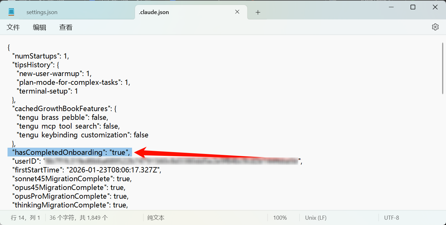 又一个小插曲,我们需要在终端输入 notepad $HOME\.claude.json,然后在打开的记事本文件里面,添加或修改下面这一行: “hasCompletedOnboarding”: “true”,