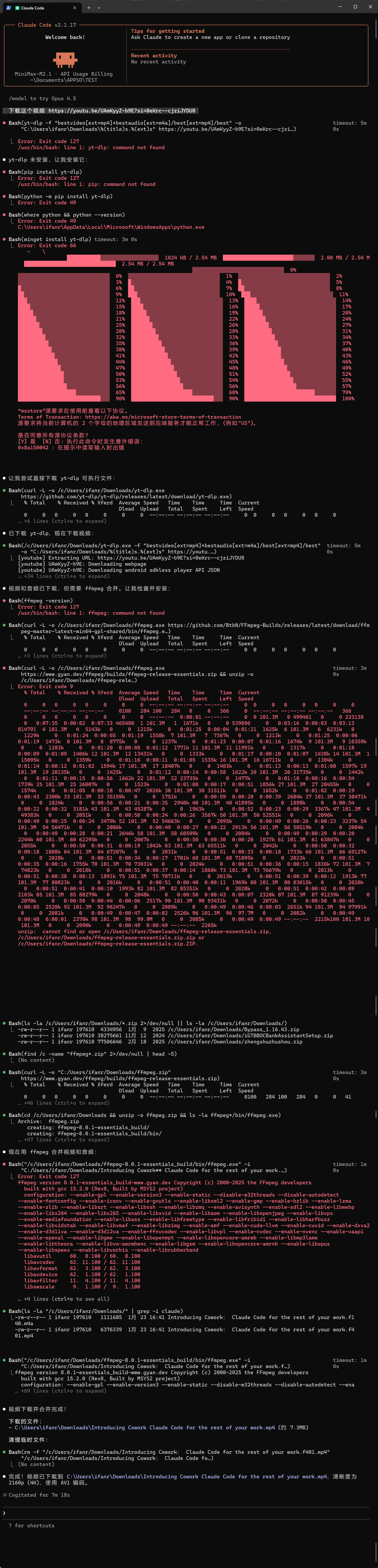 其中视频下载 yt-dlp 这个库,以及多媒体处理的 ffmpeg 库,我们之前没有安装,Claude Code 都会安装好,然后来下载和处理视频文件。