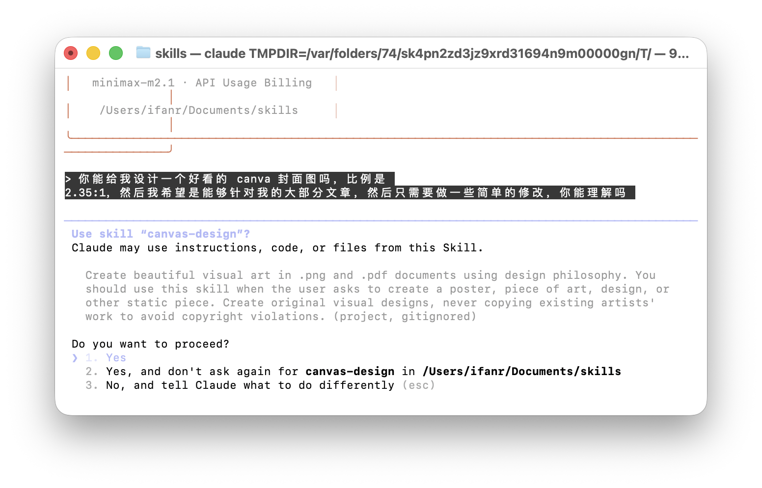 生视频没问题,生图就更不在话下。我们还可以让它生成一张 Canva 的设计图,不需要先输入斜杠 / 唤起 Skills,我们输入的提示词,就能自动触发到相关的 Skills 的使用,Claude Code 会询问我们是否要使用 canva-design 这个 skill。
