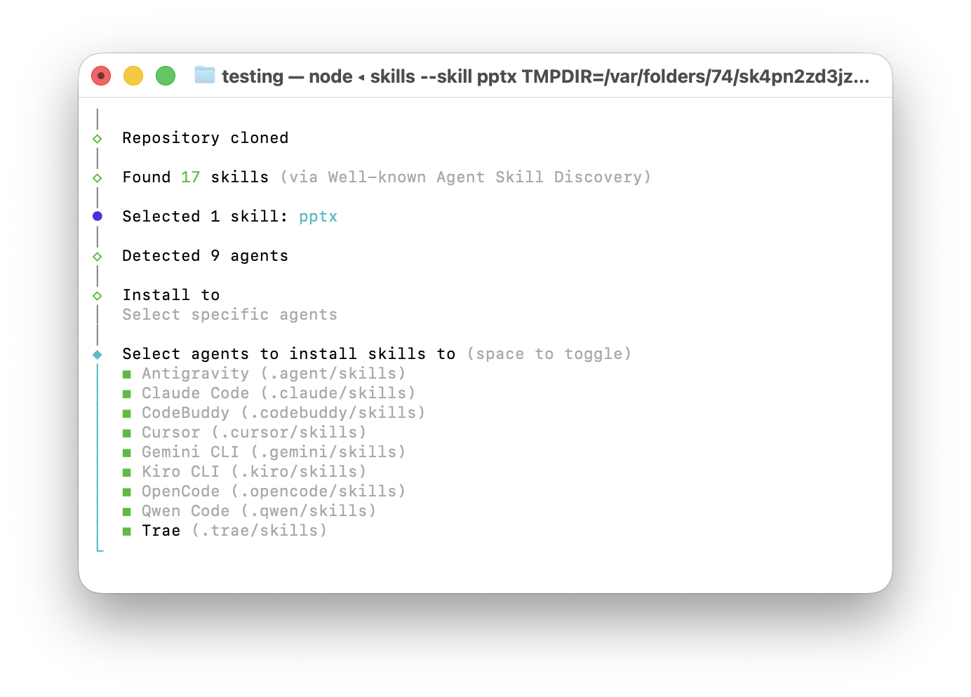 和这个缺点一样,Claude Code 并不是面向一般用户的产品,就连 Skills 也是,我们在安装 Skills 时,可以看到它能选择不同的 Agents,有 OpenCode、Cursor、字节的 Trae、腾讯的 CodeBuddy、Gemini CLI 等等工具。