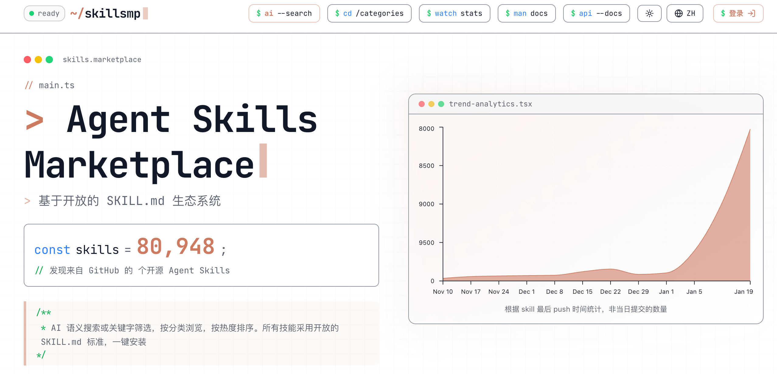 ▲ 部分 Skills 聚合网站,整理的 Skill 提交数量趋势,在今年猛增|来源:https://skillsmp.com/