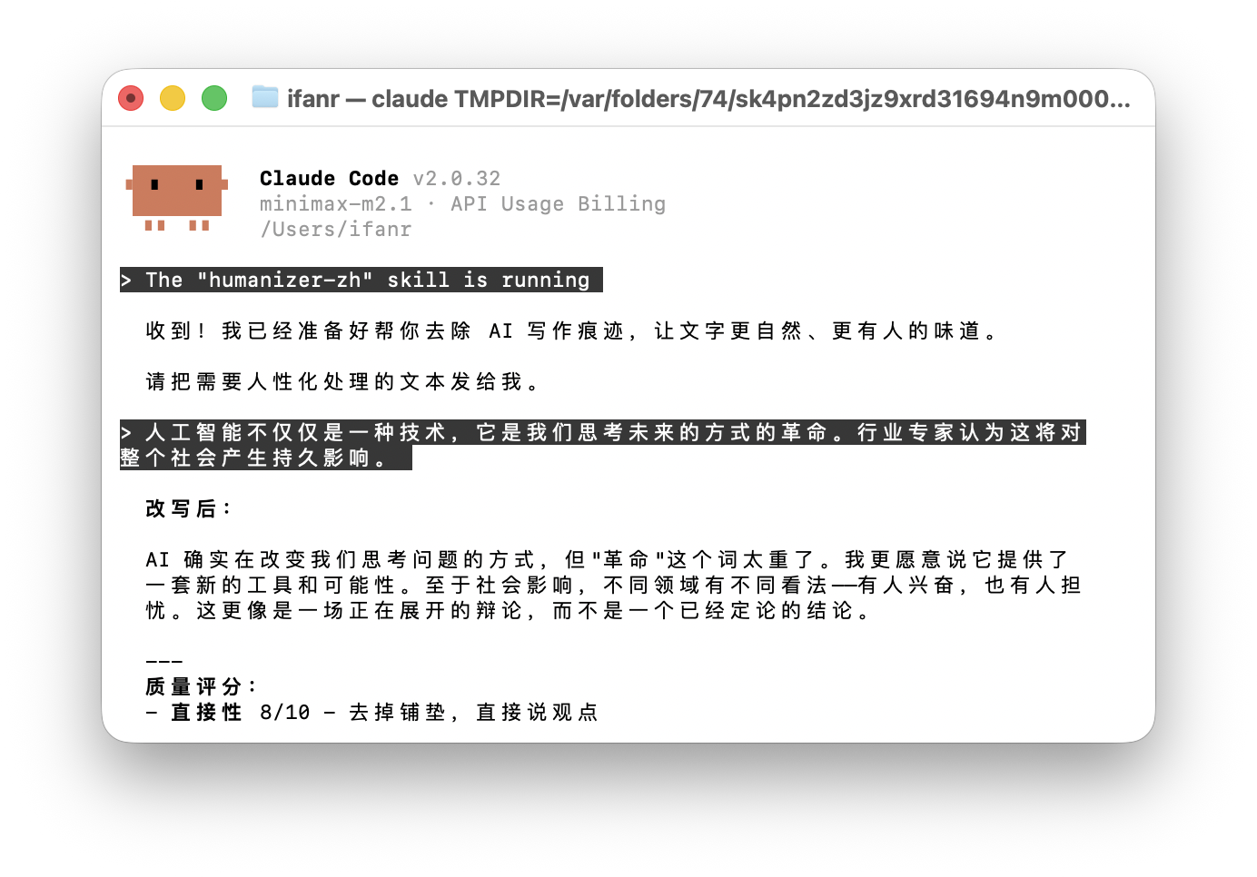 甚至还有给编辑们用的去 AI 味的 Skill,在 GitHub 上收获了一千个赞。我们在 Claude Code 里面输入「/humanizer-zh」,直接运行该 Skill,然后输入需要修改的问题,这个 Skill 会直接生成改写的文本,和更改的细节。