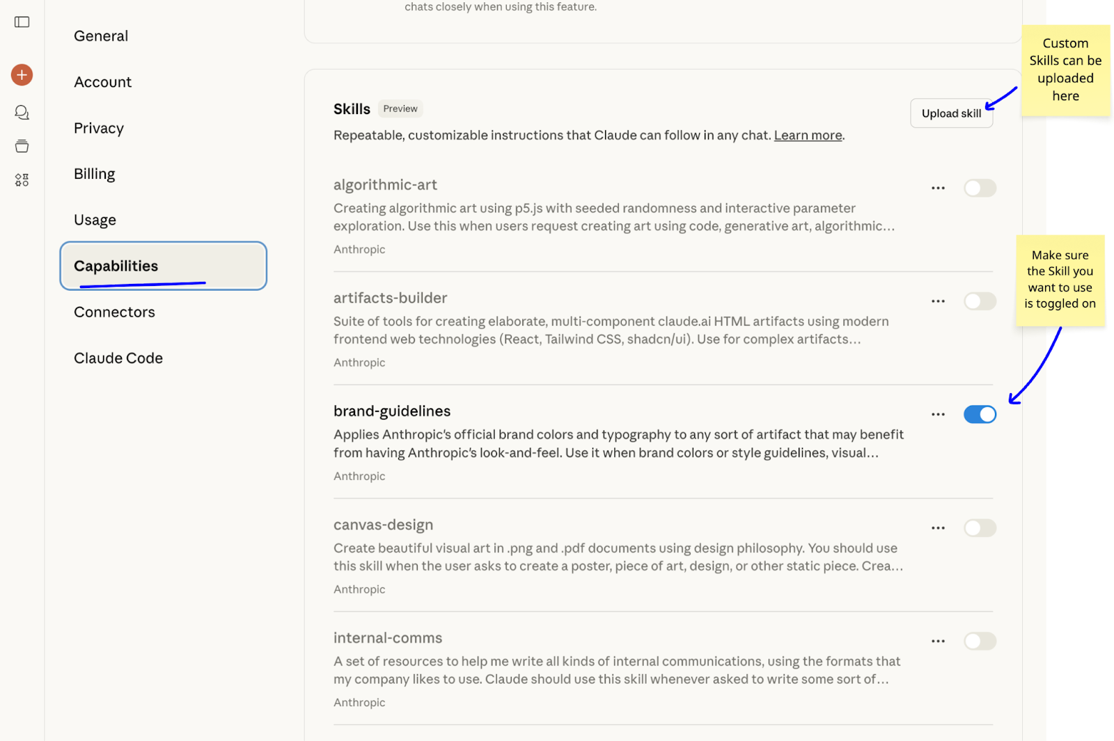▲ 在 Claude 设置界面,「Capability 能力」选项下,订阅用户能看到 Skills 功能|图片来源:https://departmentofproduct.substack.com/p/what-are-claude-skills-and-how-can