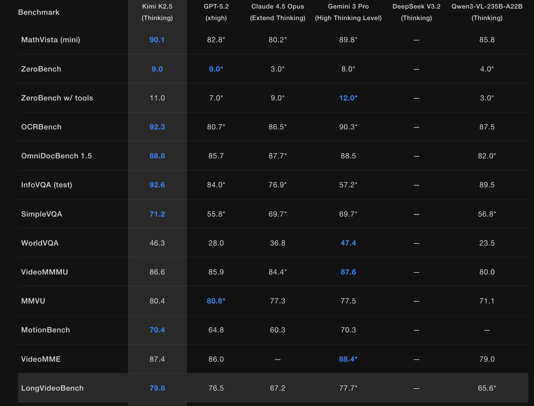 这意味着,Kimi k2.5 原来已经极其强大的长文本,再次进化成了一个既有「眼睛」能看懂复杂屏幕,又有「双手」能指挥庞大智能体集群的超级工头。在 SWE-Bench Verified(编程)和 HLE(人类最后考试)等硬核基准测试中,它不仅超越了 DeepSeek V3,甚至在多项指标上击败了闭源的 GPT 和 Gemini。