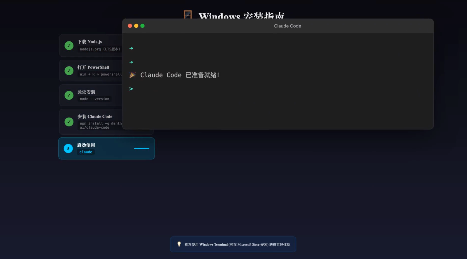 - 在终端里输入 Claude Code 的安装命令,Windows 用户可能需要额外配置环境变量。