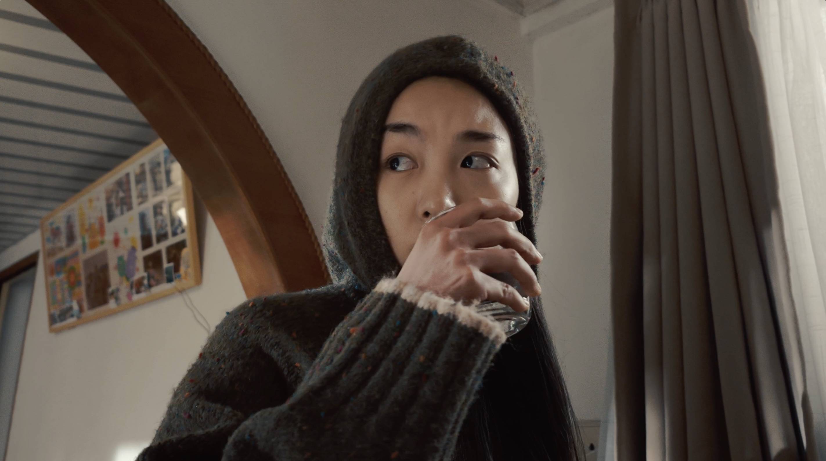 在室内昏暗的灯光下,画面里并没有出现我们在手机广告里常见的、如剥壳鸡蛋般虚假的零毛孔肌肤。相反,我们清晰地看到了她瞳孔旁的血丝,而在另一侧窗外光线的照射下,我们也能看到受光面的皮肤上,细致的肌理与瑕疵。