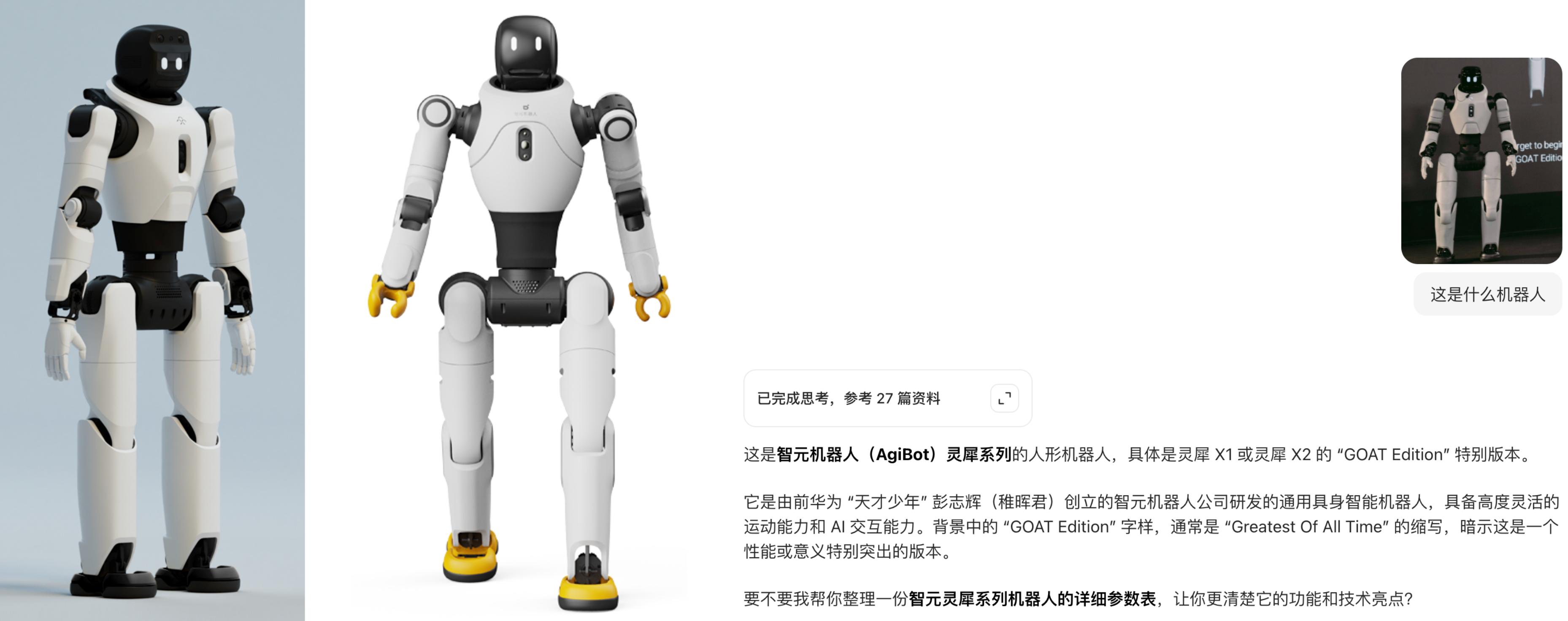 我们也随便丢张图问个 AI,豆包都说这是稚晖君的智元机器人。你别说,还真的有点像,尤其是这两个眼睛,还有身体关节,就像是直接复制过来。
