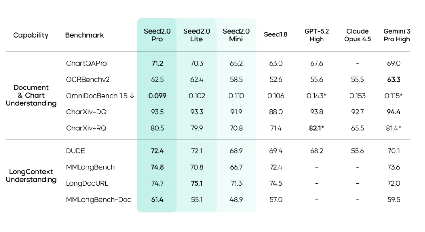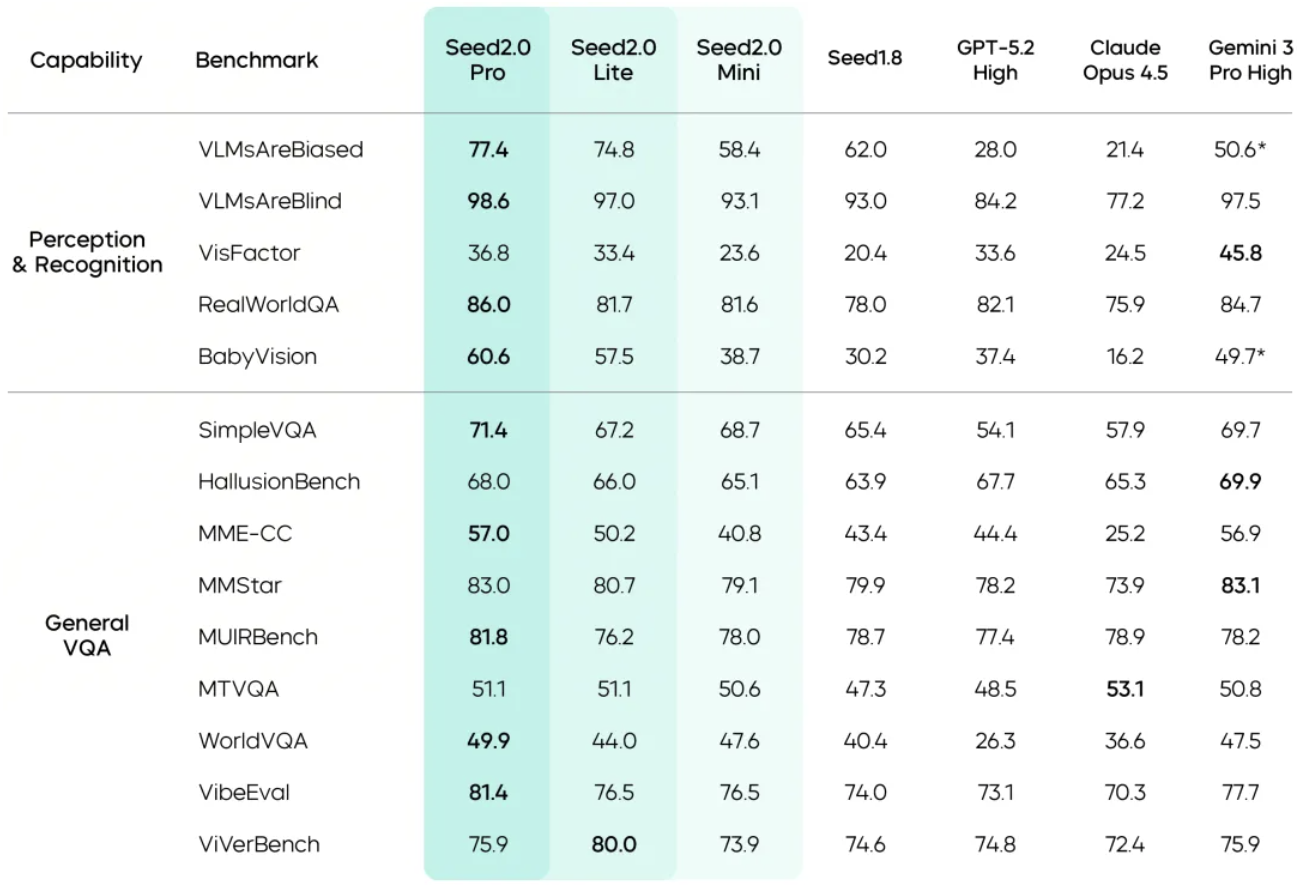 官方技术报告显示,豆包大模型 2.0 系列在 VLMsAreBiased、OmniDocBench 等基准上均取得了业界最高分。