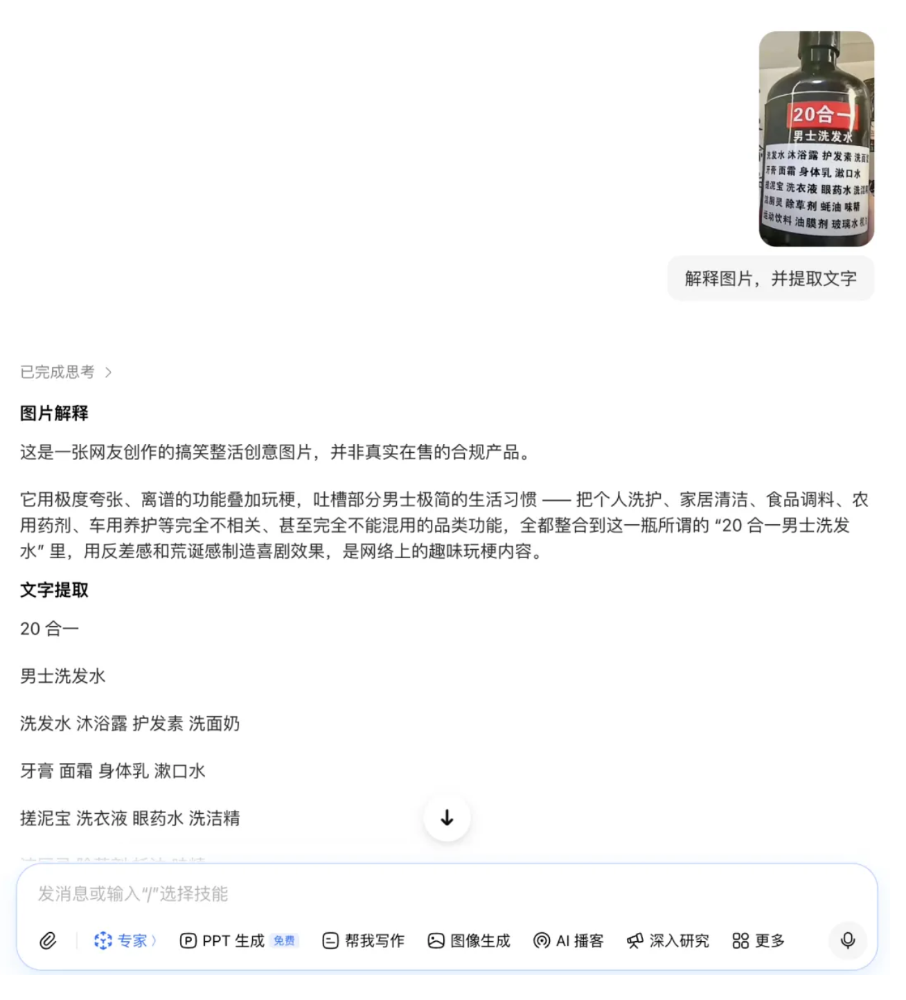 扔给豆包 2.0 Pro 后,即便文字被截断,它依然通过上下文清晰识别。而且,它没有傻乎乎地介绍产品,而是明确指出这是一种「整活」。