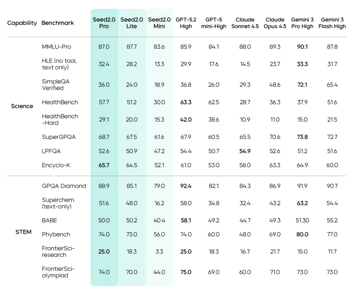为了解决这个问题,豆包大模型 2.0 重点强化了指令遵循和长程任务。在 HealthBench 上拿到第一名,在 FrontierSci 上表现强劲。