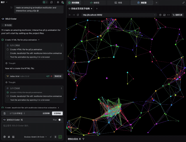 比如让它使用 p5js 创建令人惊叹的多色交互式动画,效果相当不错。代码一次跑通,屏幕上涌动的色彩不仅流畅,而且交互逻辑完全符合预期。