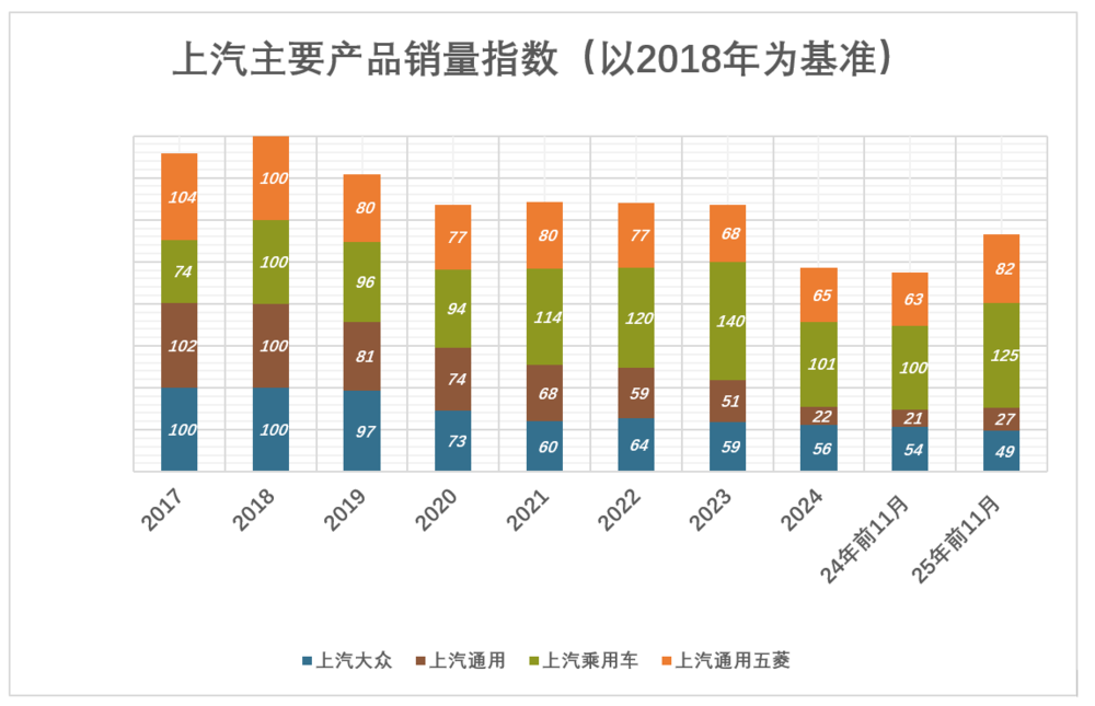 2025年前11个月销量48.7万辆,销量指数27成为上汽旗下销量掉得最惨的品牌(注:2018年前11个月,上汽通用销量达180万辆)。