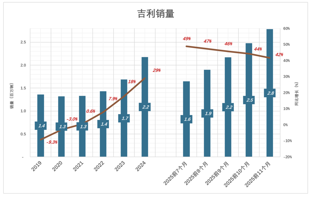 2025年1~11月,吉利汽车累计售出278.8万辆,较2024年同期增长41.7%。距提高后的销量目标相差仅21万辆。