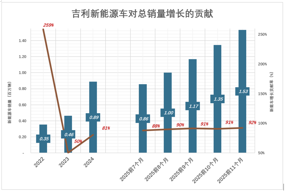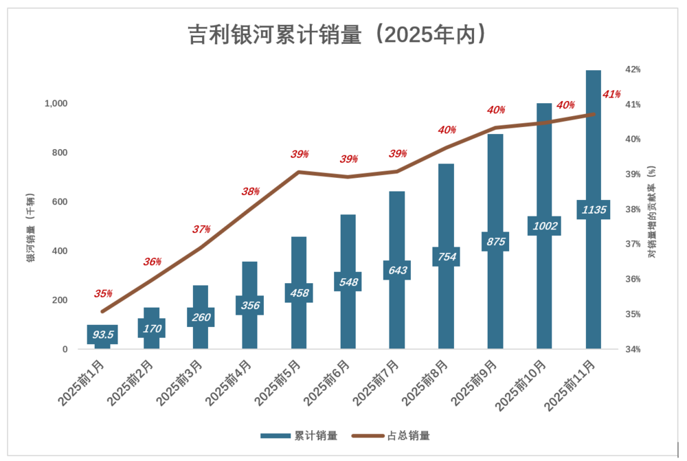 2025年,银河仍是推动吉利销量增长的主要引擎——前11个月,银河销量113.5万辆、同比净增78万辆,占吉利总销量增长的95%!