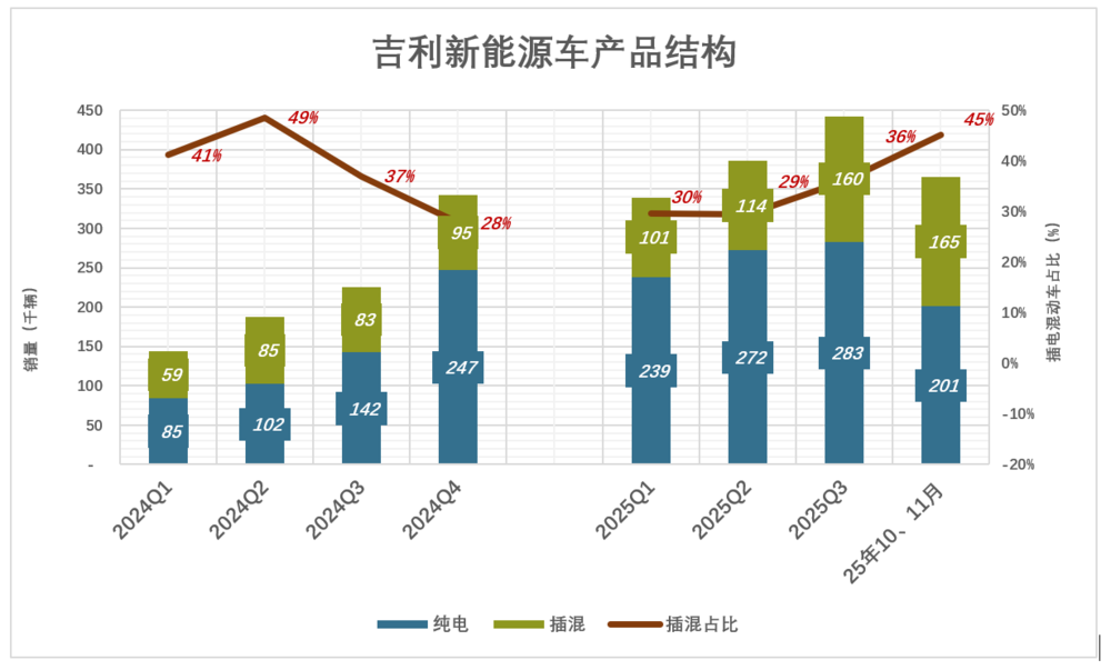 2025年Q1,插混占比开始回升,从Q1的30%到Q3的36%,再到10月、11月的45%。