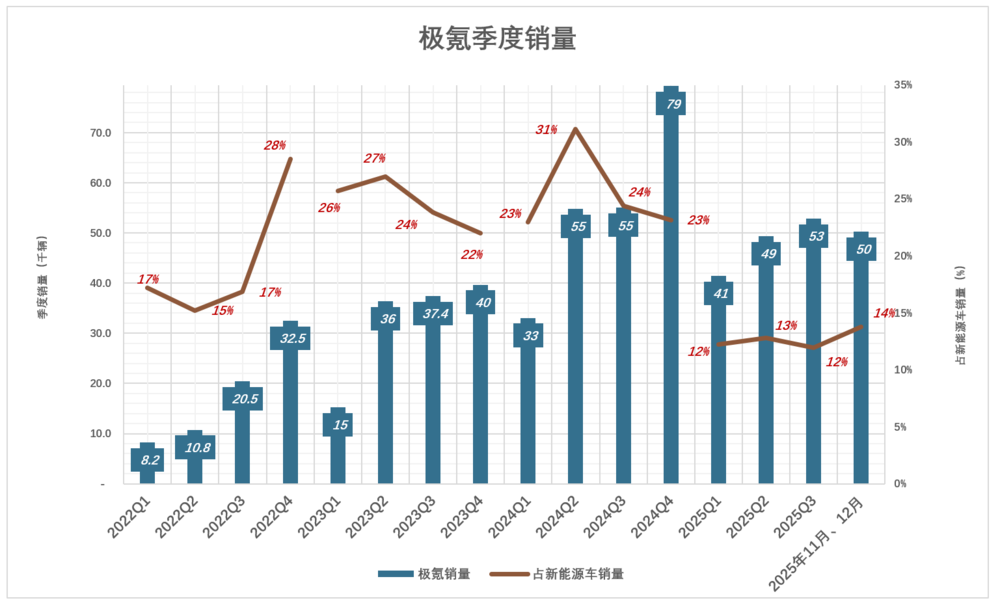 2025年,极氪“未老先衰”,Q2、Q3销量同比降幅分别为10%、4%;10月、11月销量较2024年同期下降3.4%,占吉利新能源车总销量的14%。