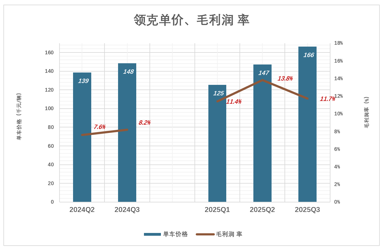 2025年,领克抓住插电混动车在欧洲热销的机会,售价显著提高——售价从Q1的12.5万一路增至Q3的16.6万,毛利润率则在Q2创出新高(13.8%)。