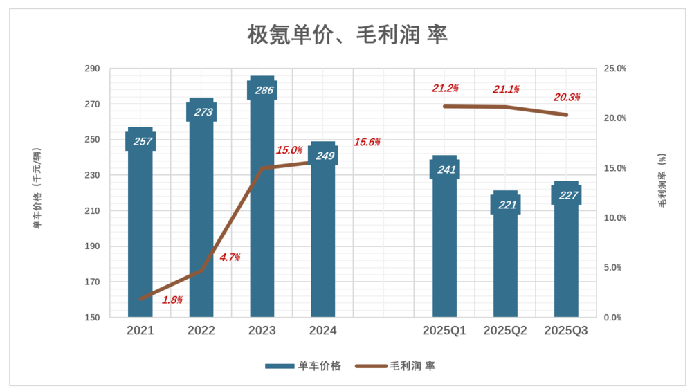 进入2025年,极氪售价显著下滑,但毛利润率保持在20%以上。