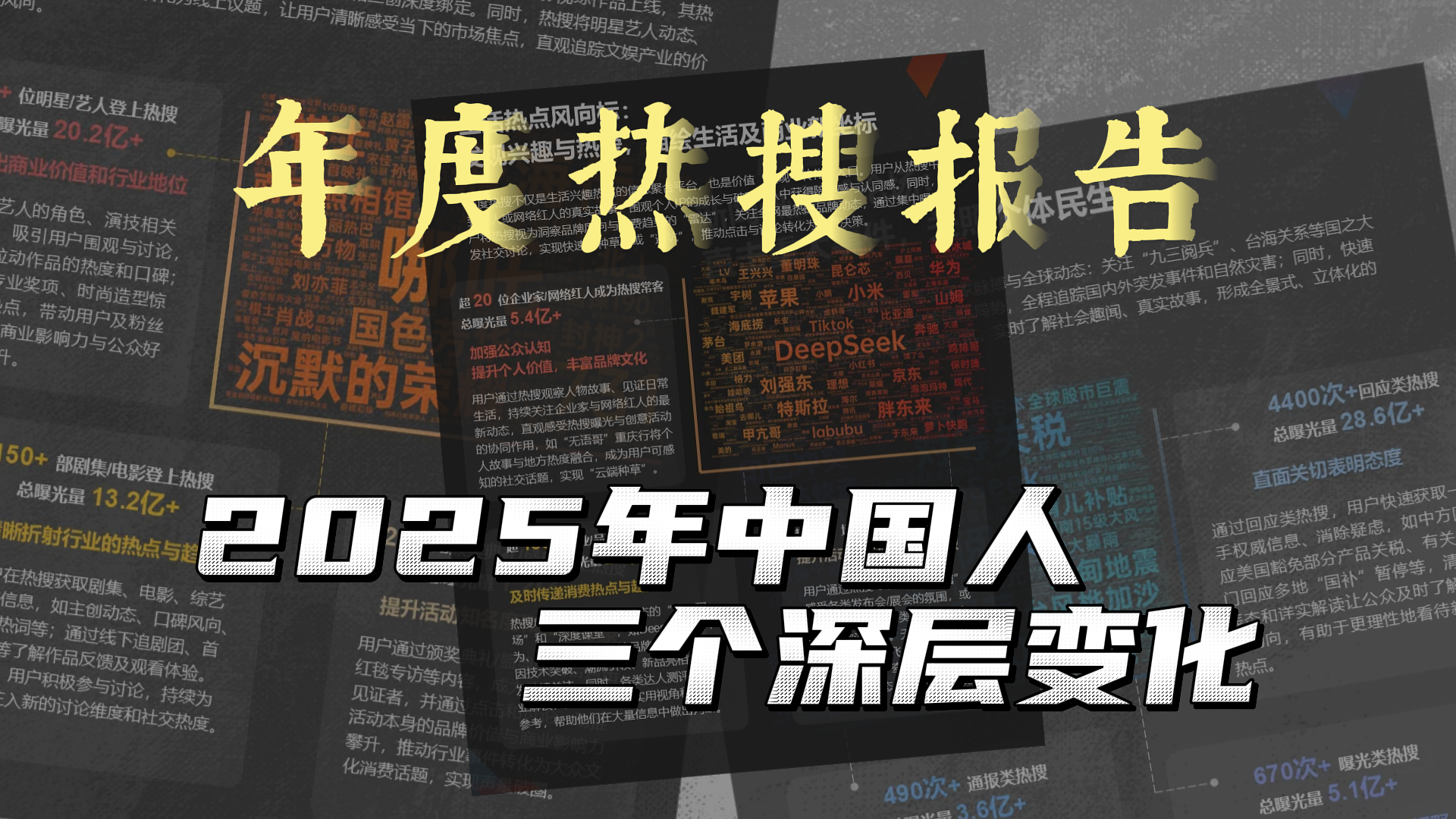 我看了一份《2025热搜报告》,发现了这一年中国人国民情绪的三个变化。这份报告记录了咱们全体网民几百亿次的点击搜索和讨论,这背后藏着的是我们这一年来最真实的喜怒哀乐、关注和焦虑,也帮我打破了“信息茧房”,看清了现实真实的模样。