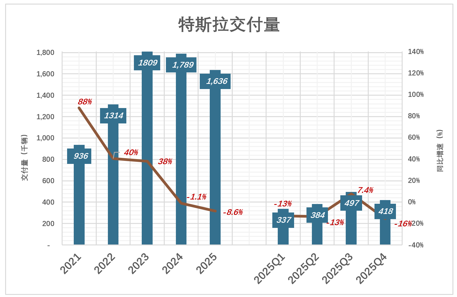 特斯拉交付量从快速增长到失速: