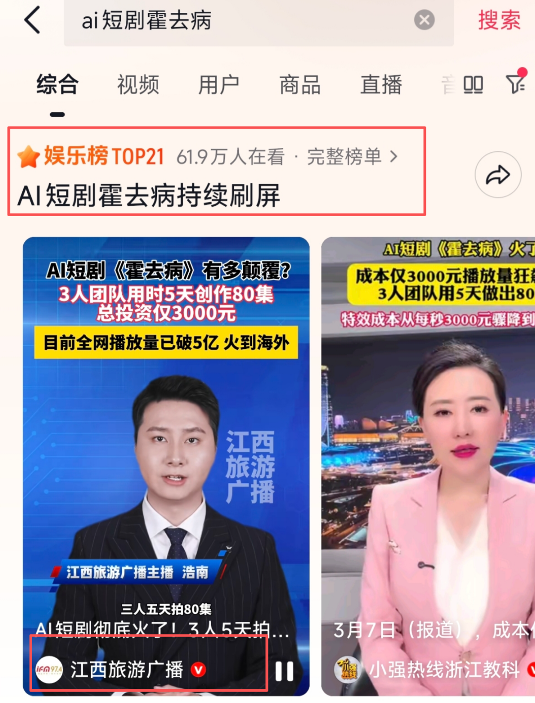 3月6日,青岛广播电视台的点时新闻登上了热搜第二。词条是:#国产AI短剧火到海外、#破5亿播放AI短剧成本仅3000#。