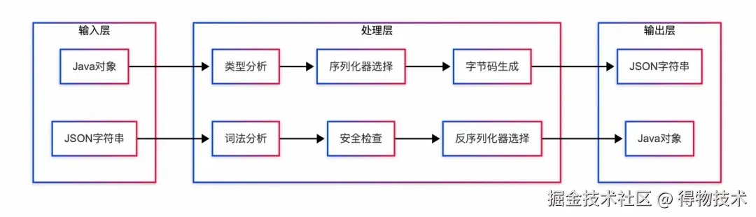 整体上Fastjson通过统一的门面API(JSON.toJSONString/parseObject)调用核心控制器(JSONSerializer/DefaultJSONParser),利用ASM字节码生成或反射机制,配合SerializeWriter/JSONLexer进行高效的Java对象与JSON字符串间双向转换,同时提供配置缓存、循环引用检测和AutoType安全防护等优化机制。下图为框架处理数据流: